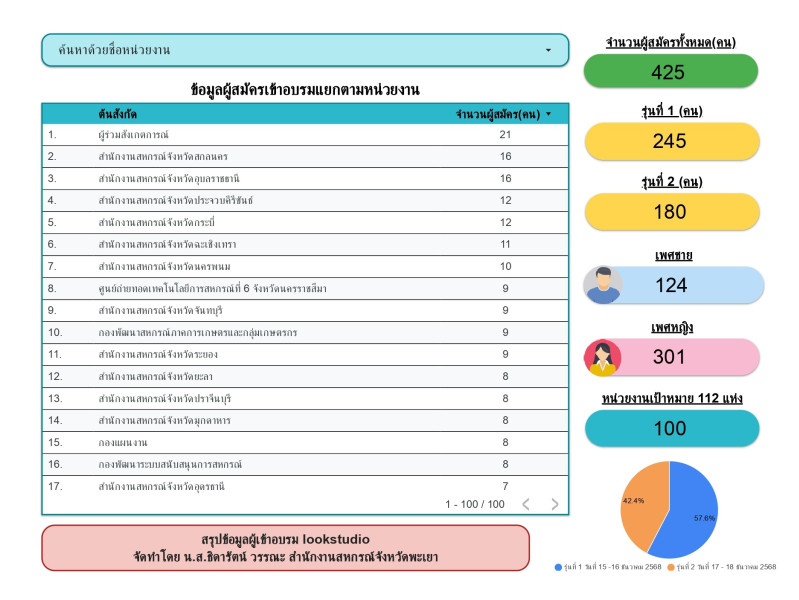 การอบรมครั้งนี้เป็นการถ่ายทอดความรู้เกี่ยวกับการรายงานสรุปผลข้อมูล Dashboard ด้วย Looker Studio รุ่นที่ 2 ระยะเวลา 2 วัน ระหว่างวันที่ 17 – 18 ธันวาคม 2568 มีผู้เข้ารับการอบรม 180 คน โดยมีวัตถุประสงค์เพื่อพัฒนาทักษะเบื้องต้นของผู้เข้าอบรมเกี่ยวกับการการงานสมัครใช้งาน Looker Studio และสามารถนำความรู้จากการอบรมไปประยุกต์ใช้ในการปฏิบัติงาน รวมทั้งเป็นการสร้างเครือข่ายการแลกเปลี่ยนเรียนรู้ด้านเทคโนโลยีสารสนเทศ